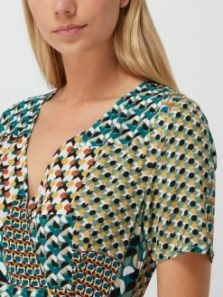 Das Wickelkleid von Apricot ist aus reiner Viskose gefertigt. Es zeigt sich in taillierter Passform mit grafischem Muster, kurzen Ärmeln und Schnürverschluss.
