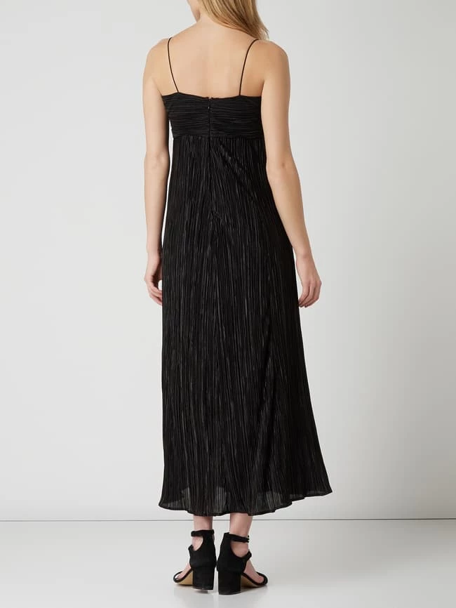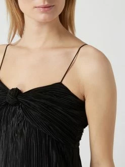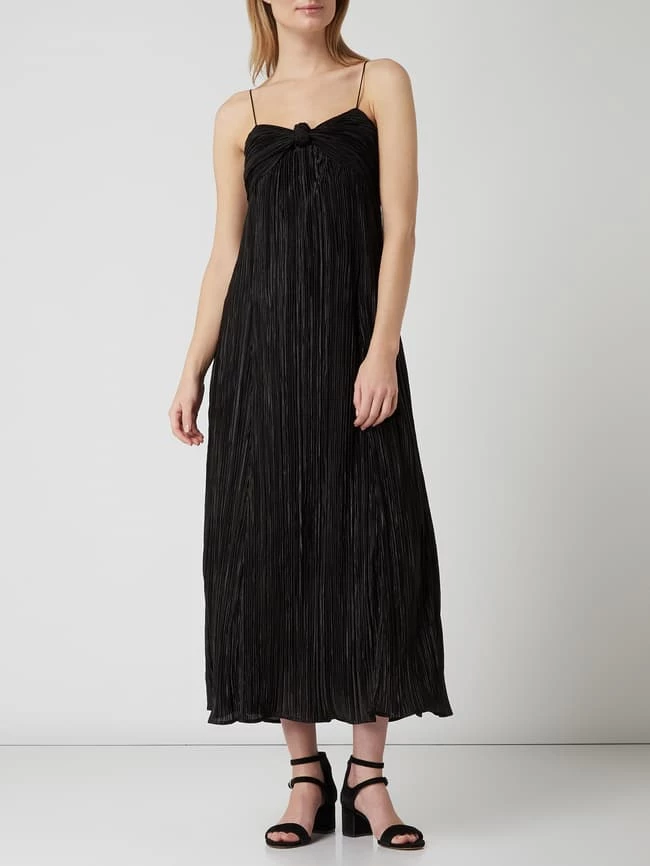 Das Kleid von Bardot ist aus schimmerndem Material gefertigt und tailliert geschnitten. Es zeigt sich mit Plisseefalten, Knotendetail am Ausschnitt und elastischen Spaghettiträgern.
