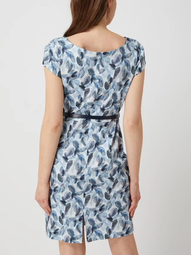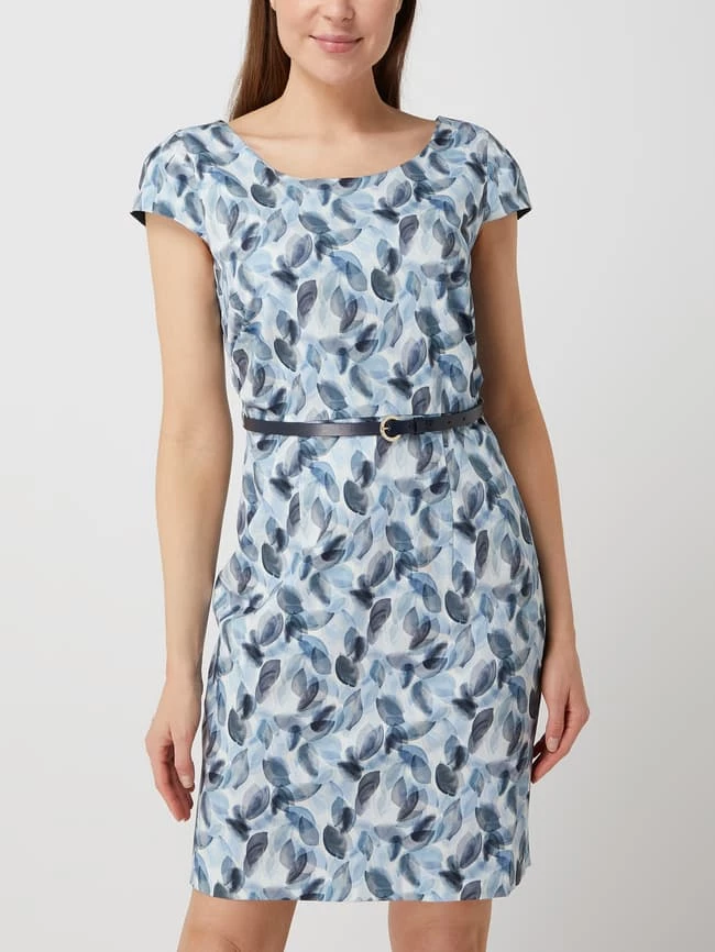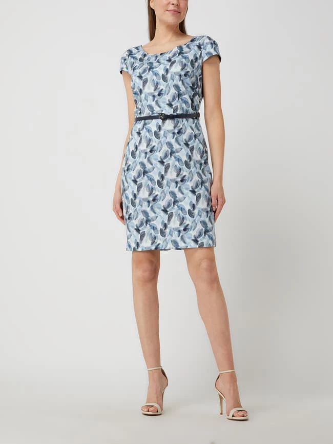 Das Etuikleid von BETTY & CO. ist aus einem Baumwoll-Elasthan-Mix gefertigt. Es zeigt sich in taillierter Passform mit Blättermuster, Rundhalsausschnitt und schmalem Taillengürtel.