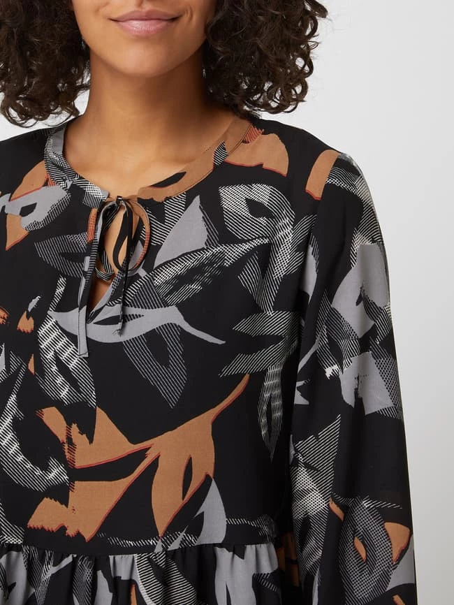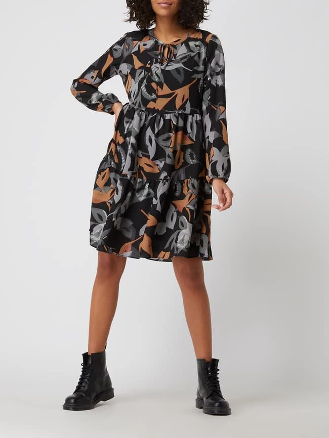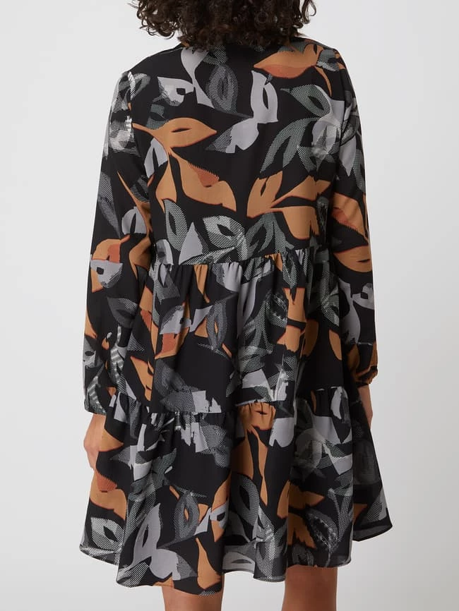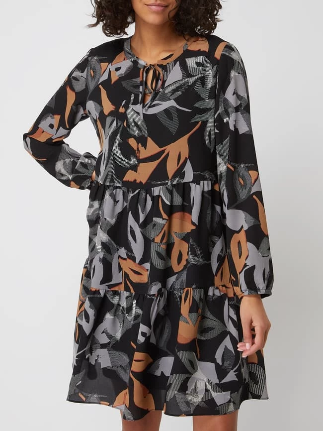 Das Kleid von BETTY & CO. ist aus Chiffon gefertigt und tailliert geschnitten. Es kommt mit Allover-Muster, Schnürung und Volantsaum.