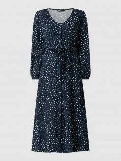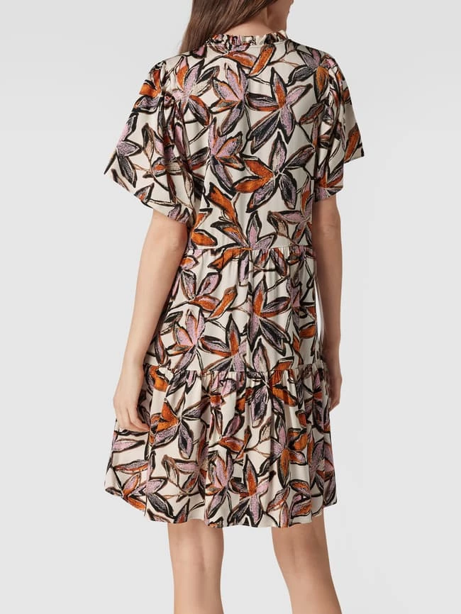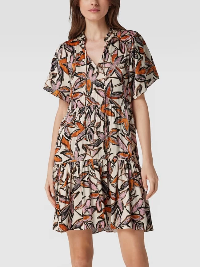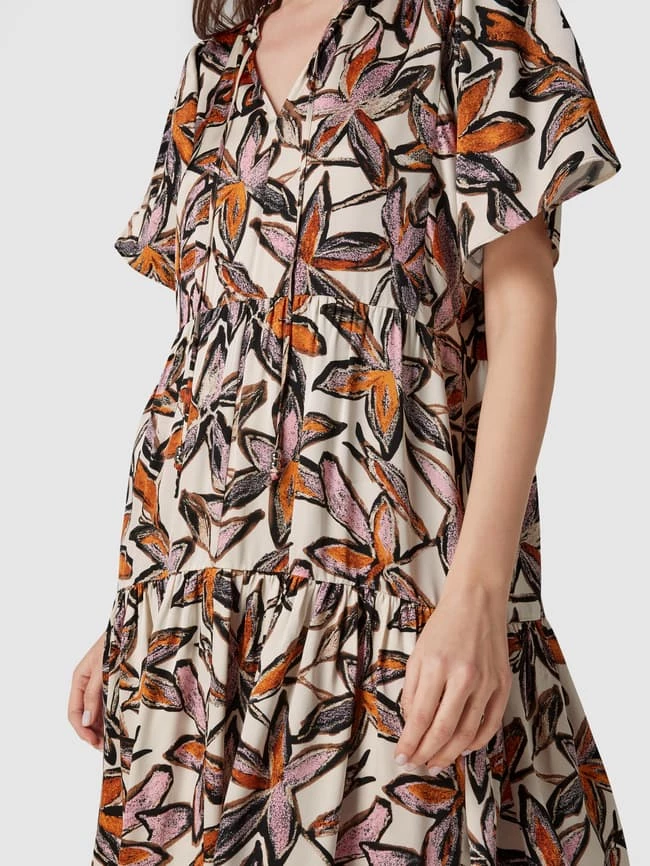 Das knielange Kleid von BOSS ist aus einem Acetat-Viskose-Mix gefertigt und locker geschnitten. Es kommt mit V-Ausschnitt, Schnürung und floralem Allover-Muster sowie Volantsaum.