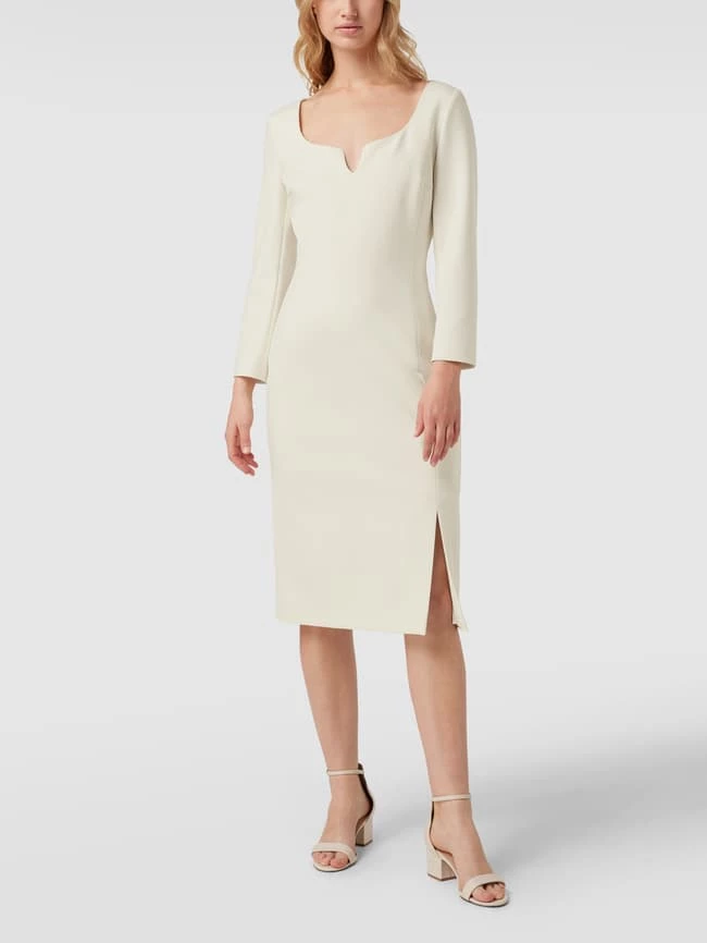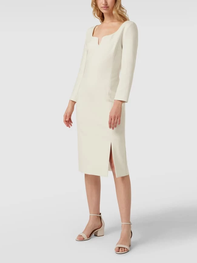 Das Midikleid von BOSS ist aus strapazierfähigem Material gefertigt und gerade geschnitten. Es zeigt sich mit langen Ärmeln, tiefem Rundhalsausschnitt und Schlitz auf der Vorderseite.