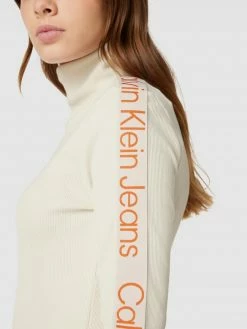 Das Midikleid von Calvin Klein Jeans ist aus einem Baumwoll-Mix mit Stretch-Anteil gefertigt und in tailliertem Schnitt gehalten. Es zeigt sich mit geripptem Rollkragen, Logo-Stitching und Reißverschluss.