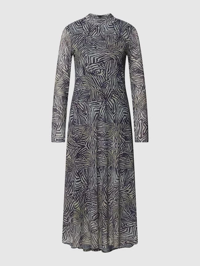 Das Midikleid von comma ist aus einem strapazierfähigen Material gefertigt und im taillierten Schnitt gehalten. Es zeigt sich mit Allover-Muster, Stehkragen sowie Label-Print.