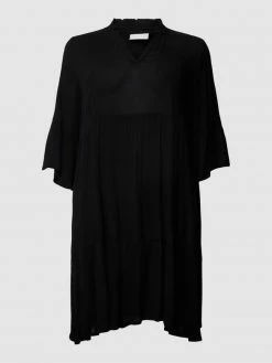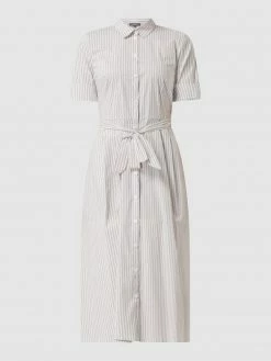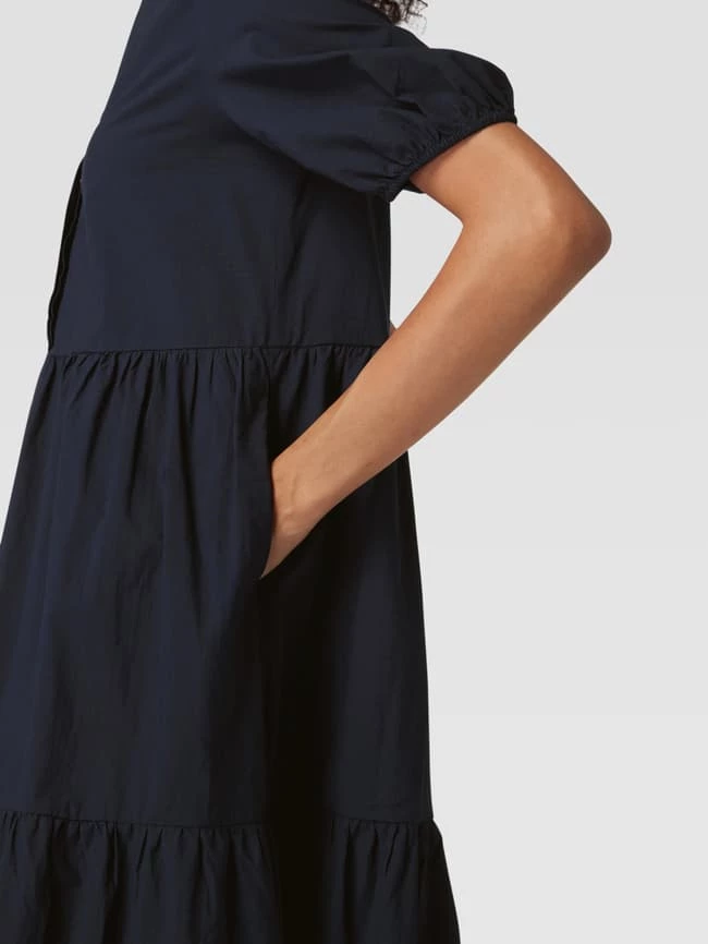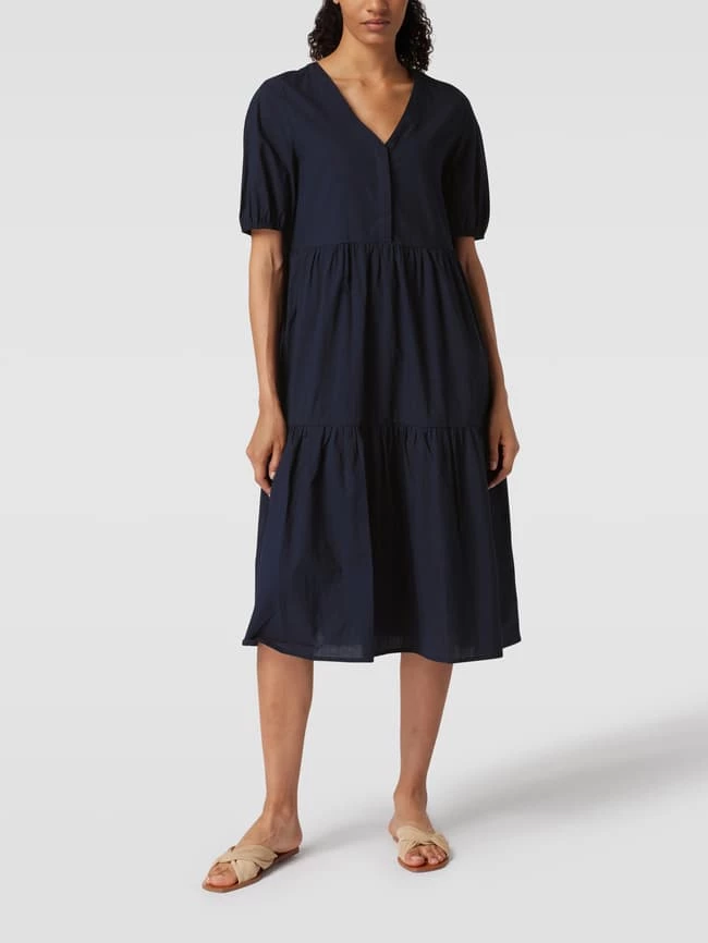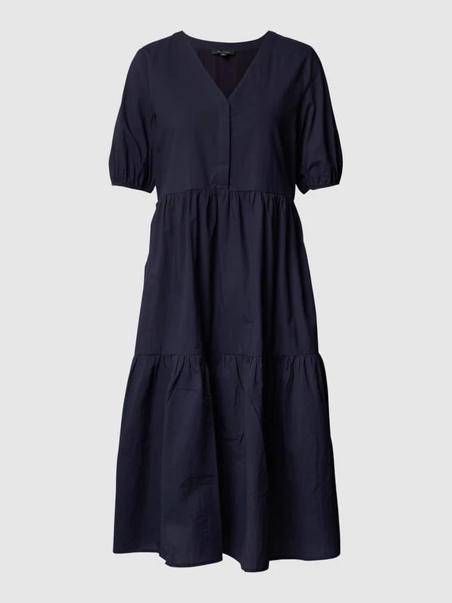 Das Midikleid von comma ist aus reiner Baumwolle gefertigt und tailliert geschnitten. Es kommt im Stufen-Look mit V-Ausschnitt, kurzer Knopfleiste und ausgestellter Rockpartie.