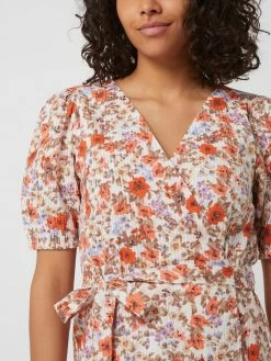 Das Wickelkleid von Cream ist aus reiner Baumwolle gefertigt und tailliert geschnitten. Es zeigt sich mit floralem Muster, kurzen Puffärmeln und Taillengürtel zum Binden.