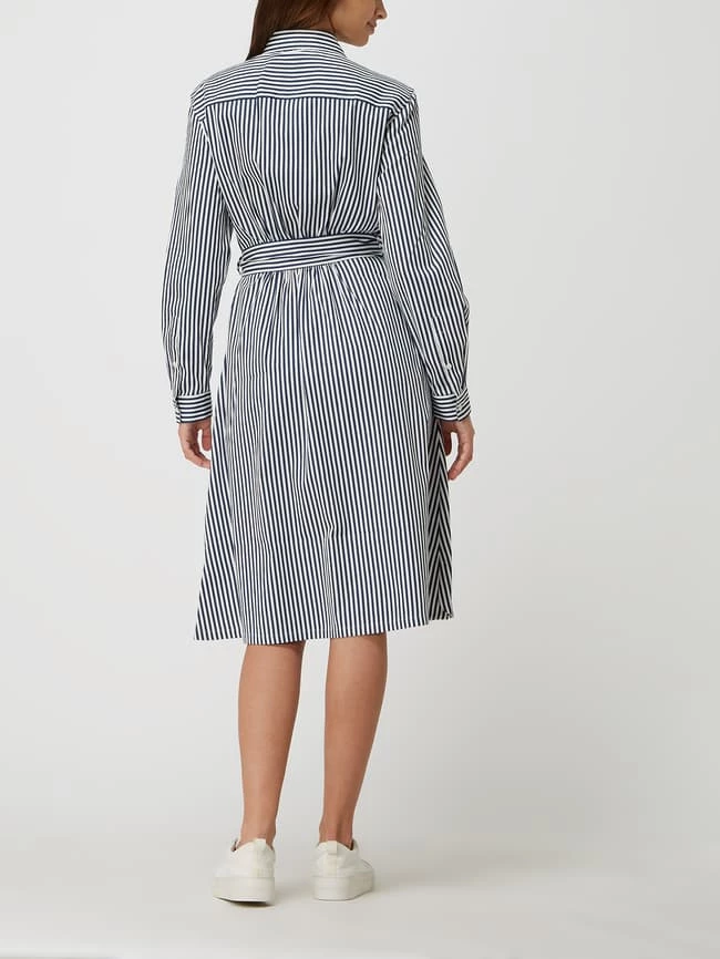 Das Blusenkleid von GERRY WEBER COLLECTION ist aus einer Baumwollmischung mit Stretch-Anteil gefertigt und tailliert geschnitten. Es kommt mit Streifenmuster, Umlegekragen und Taillengürtel.