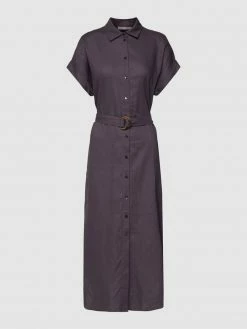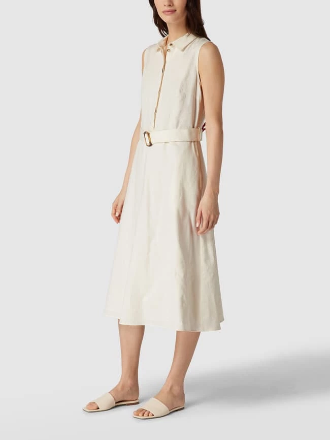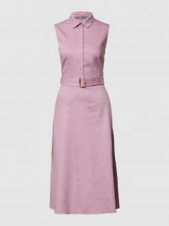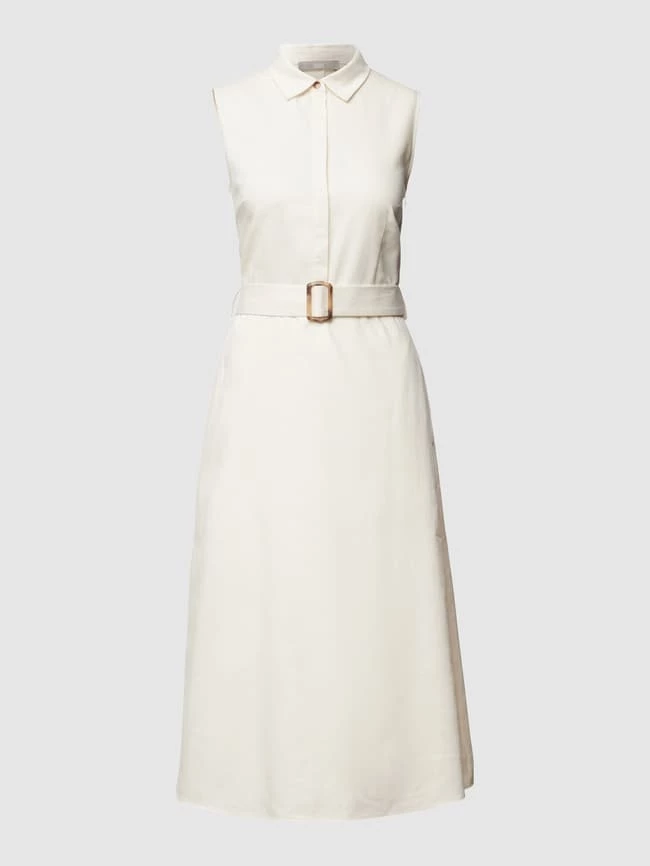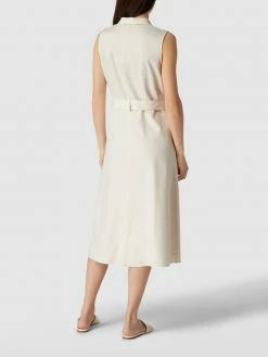 Das Midikleid von Jake*s Collection ist aus einem Baumwoll-Leinen-Viskose-Mix gefertigt und tailliert geschnitten. Es kommt im ärmellosen Design mit Blusenkragen, Taillengürtel sowie kurzer, verdeckter Knopfleiste.