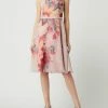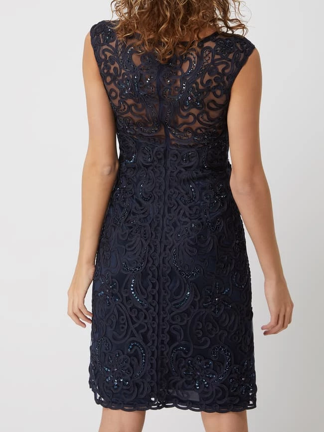 Das Cocktailkleid von LUXUAR LIMITED ist aus Tüll gefertigt und eng anliegend geschnitten. Es zeigt sich mit Zierborten, Strasssteinen und Nahtreißverschluss auf der Rückseite.