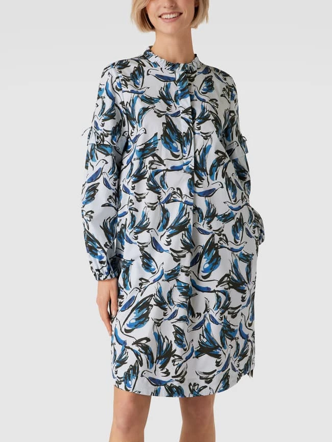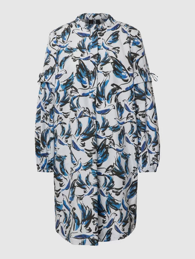 Das Blusenkleid von Marc Cain ist aus reiner Baumwolle gefertigt und locker geschnitten. Es kommt in Knielänge mit Allover-Muster, Stehkragen und kurzer Knopfleiste.