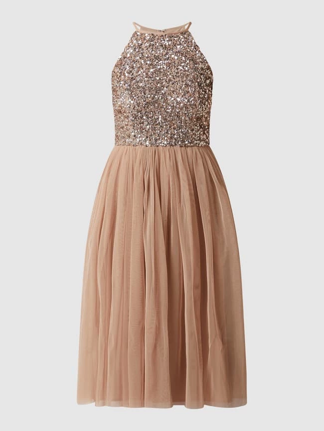 Das Cocktailkleid von Maya Deluxe ist aus Mesh gefertigt und tailliert geschnitten. Es zeigt sich mit amerikanischem Ausschnitt, Pailletten und ausgestelltem Rockteil.