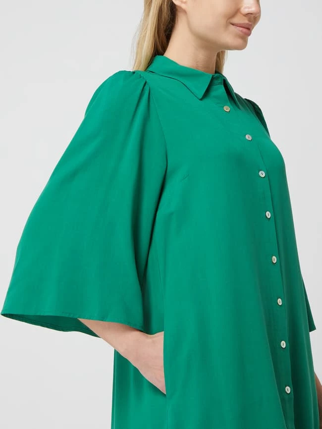 Das Midikleid von mbyM ist aus einem Viskose-Lyocell-Mix gefertigt. Es zeigt sich in ausgestellter Passform mit Umlegekragen und Knopfleiste.