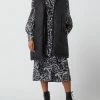 Das Blusenkleid von MILANO ITALY ist aus reiner Viskose gefertigt und tailliert geschnitten. Es zeigt sich in Midilänge mit Paisley-Muster, Stehkragen und 3/4-Arm.