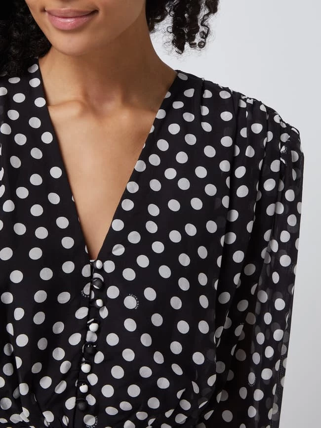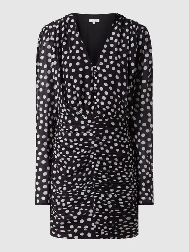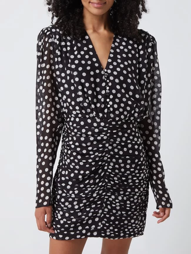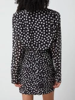 Das Kleid von Miss Sixty ist aus reiner Seide gefertigt und eng anliegend geschnitten. Es kommt mit Polka Dots, Schulterpolstern und Puffärmeln.