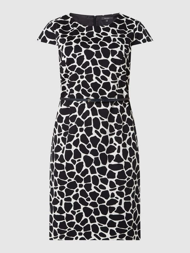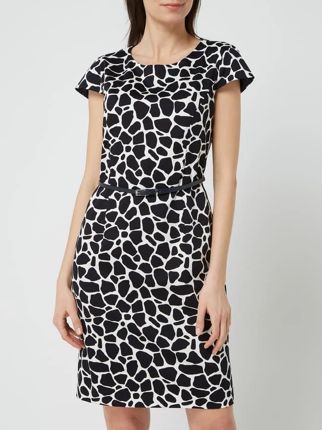 Das Kleid von MONTEGO ist aus einem Baumwoll-Elasthan-Mix gefertigt und tailliert geschnitten. Es zeigt sich mit Animal-Print, schmalem Gürtel und leicht ausgestelltem Rockteil.