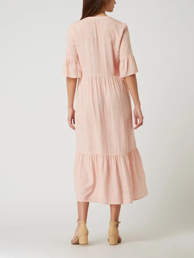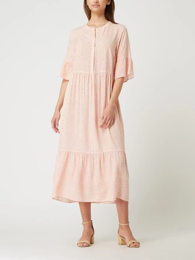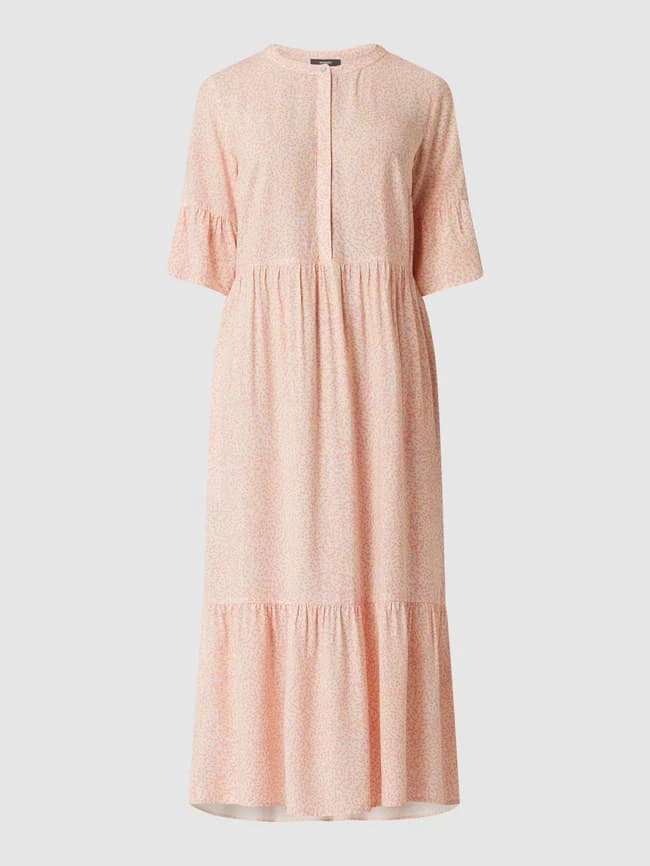 Das Midikleid von MONTEGO ist aus reiner Viskose gefertigt und ausgestellt geschnitten. Es zeigt sich im Stufen-Look mit Stehkragen, 3/4-Arm und Eingrifftaschen.