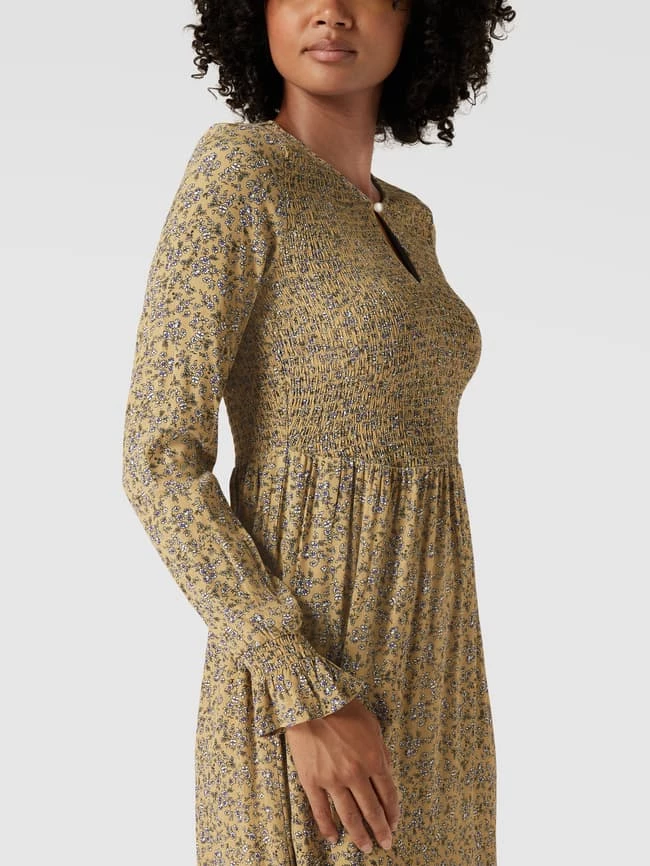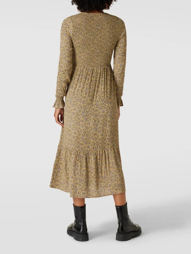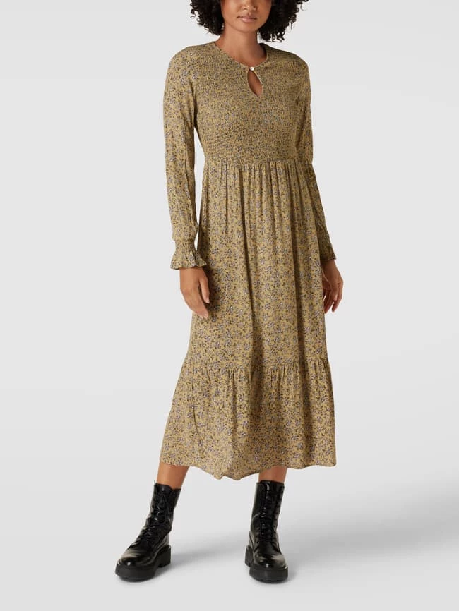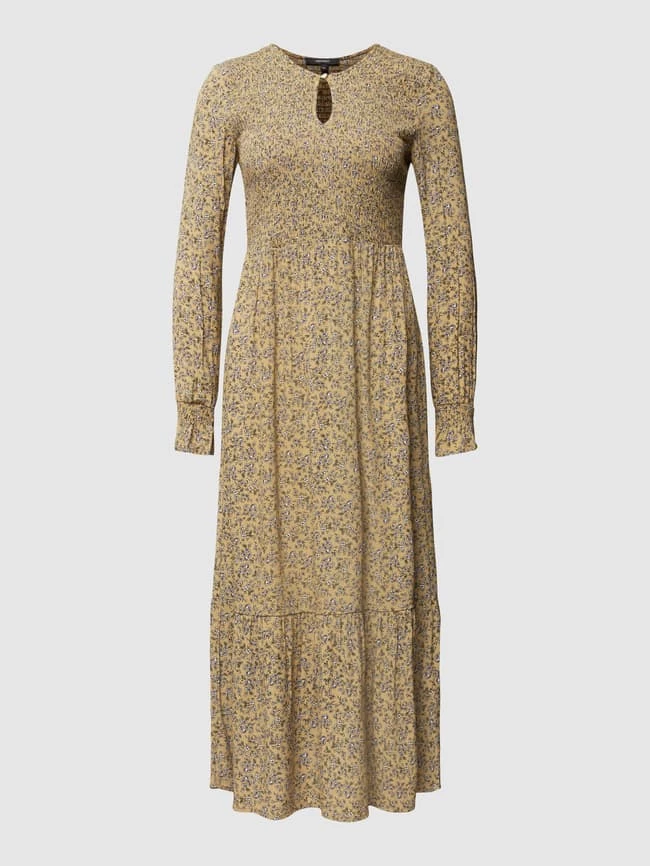 Das Midikleid von MONTEGO ist aus reiner Viskose gefertigt und tailliert geschnitten. Es kommt mit Smok-Details, Schlüsselloch-Ausschnitt und Volantsaum sowie floralem Muster.