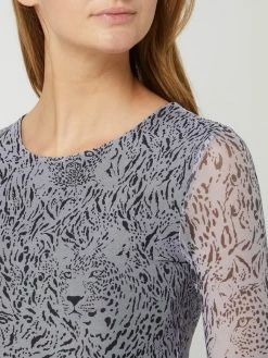 Das Kleid von moves ist aus Mesh gefertigt und eng anliegend geschnitten. Es kommt in Midilänge mit Leopardenmuster und blickdichtem Unterkleid.