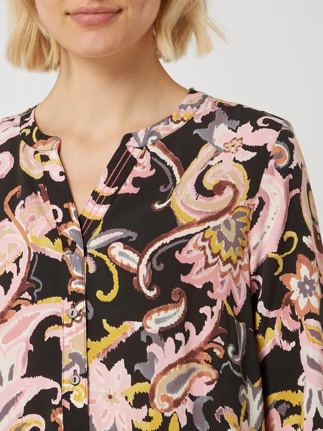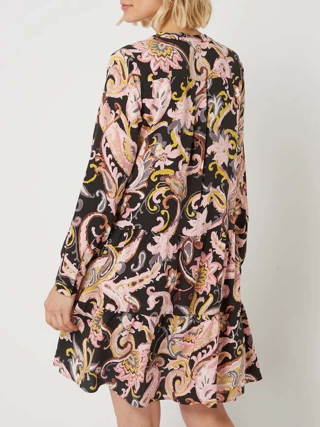 Das Kleid von Smith & Soul ist aus reiner Viskose gefertigt und leicht ausgestellt geschnitten. Es zeigt sich mit Allover-Muster, kurzer Knopfleiste und Raffungen.