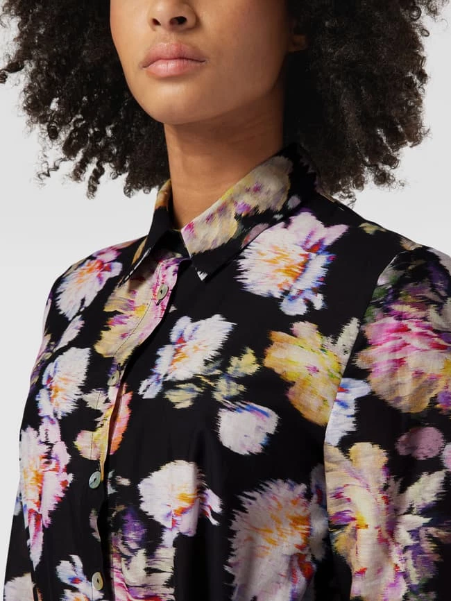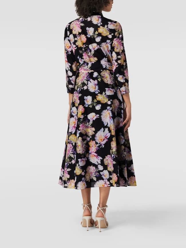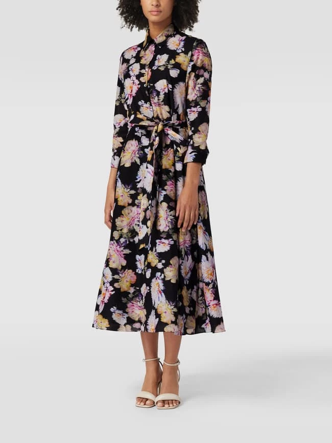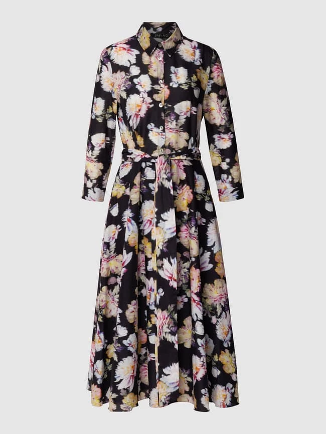 Das Cocktailkleid von SWING ist aus reiner Baumwolle gefertigt und kommt in A-Linie. Es zeigt sich im semitransparenten Look mit Umlegekragen und floralem Allover-Muster.
